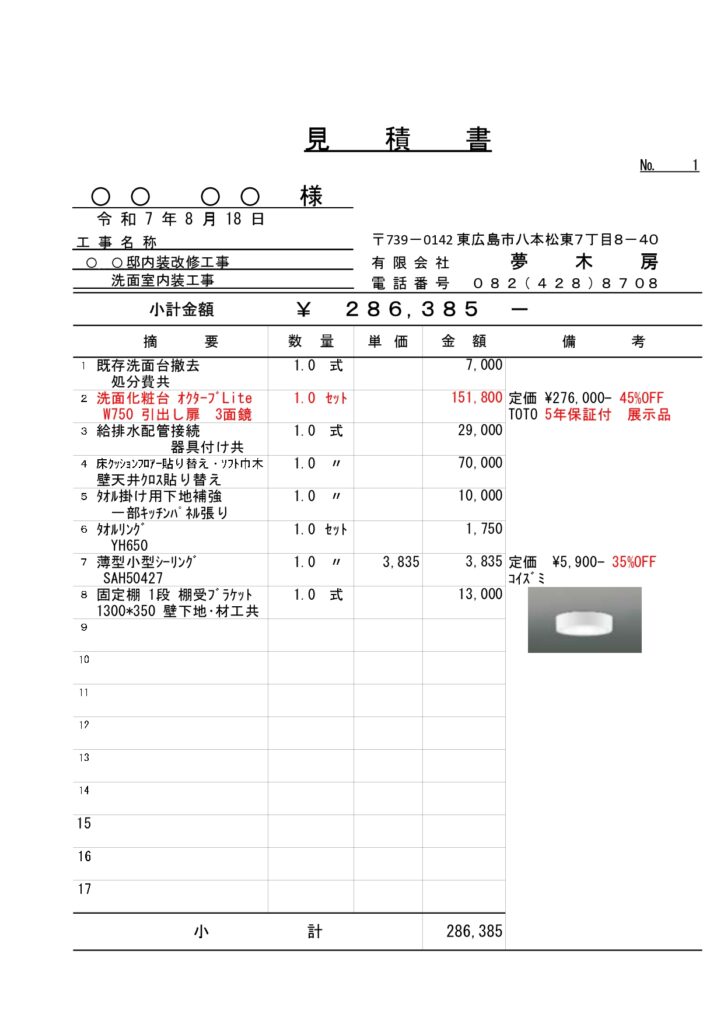 | 既存洗面台撤去 処分費共 | 1 | 7,000 | 7,000 |